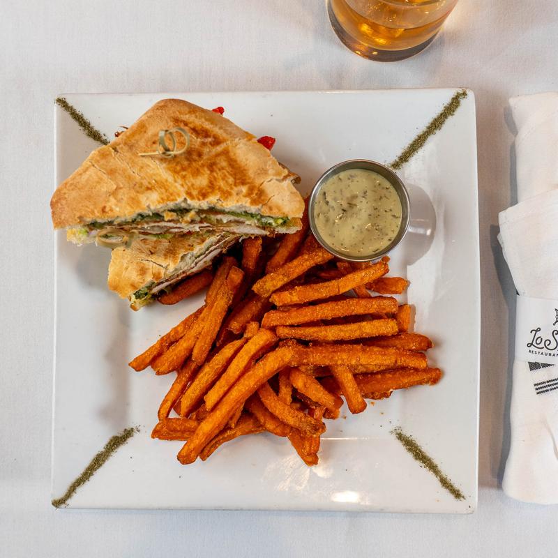 Lo Sano's mojo-marinated pork layered with ham, Swiss cheese, pickles, mayo & mustard served with fries