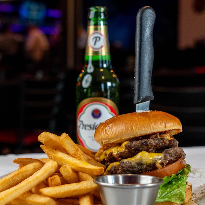 Smashed Beef Burger with lettuce, tomatoes, caramelized onions and cheddar cheese served with French or Sweet Potato Fries